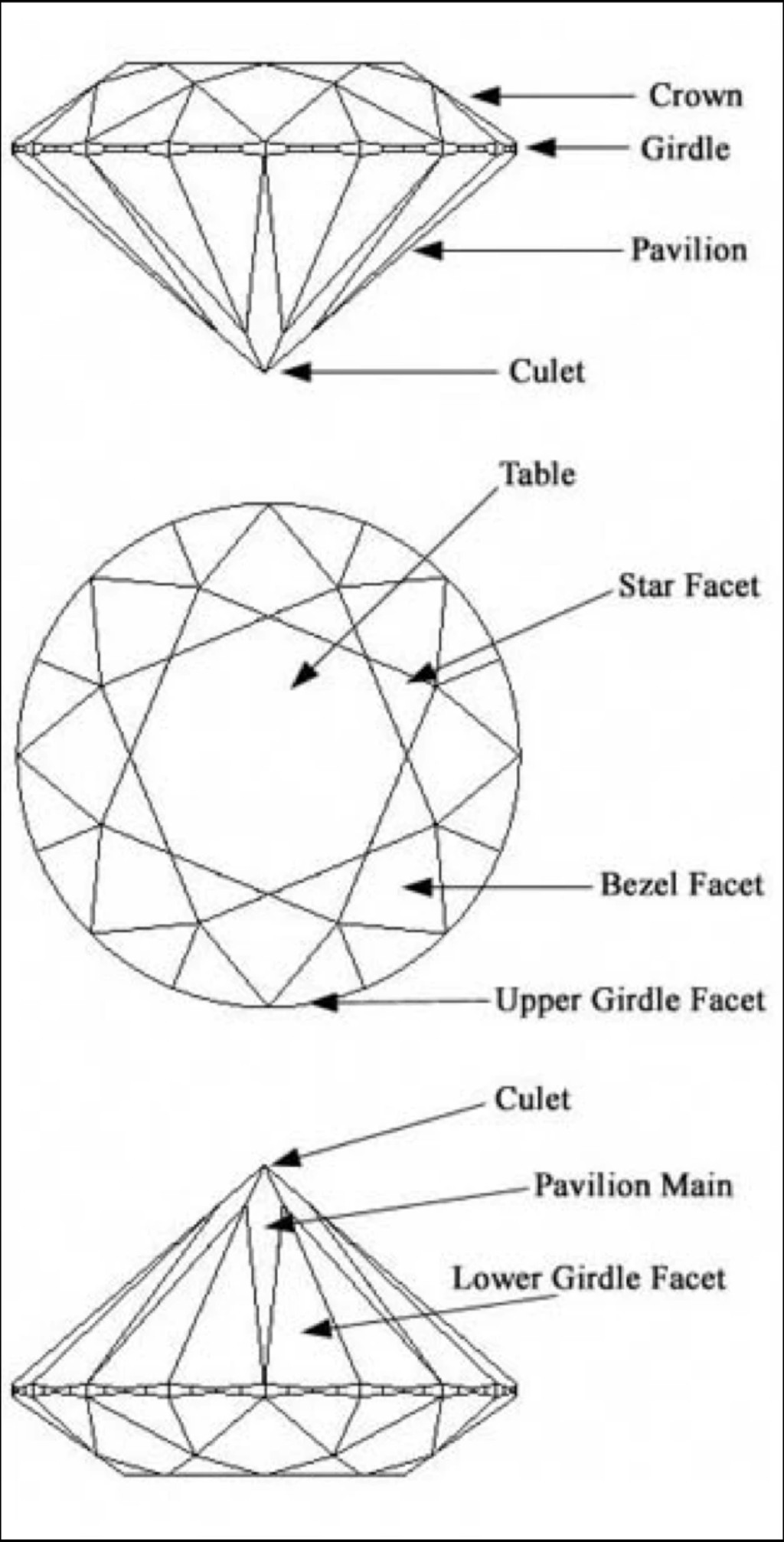 Culet: Pequeña faceta en la punta inferior (puede o no estar presente).
