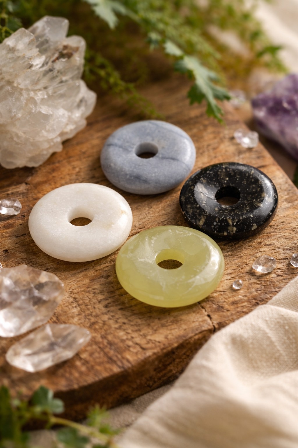 Las Piedras Pi, también conocidas como donut stone o piedras dona, son gemas pulidas en forma circular con un orificio central. Su diseño no es casual: el círculo representa el universo, mientras que el vacío central simboliza el flujo de energía, el equilibrio y la conexión entre el mundo físico y el espiritual.